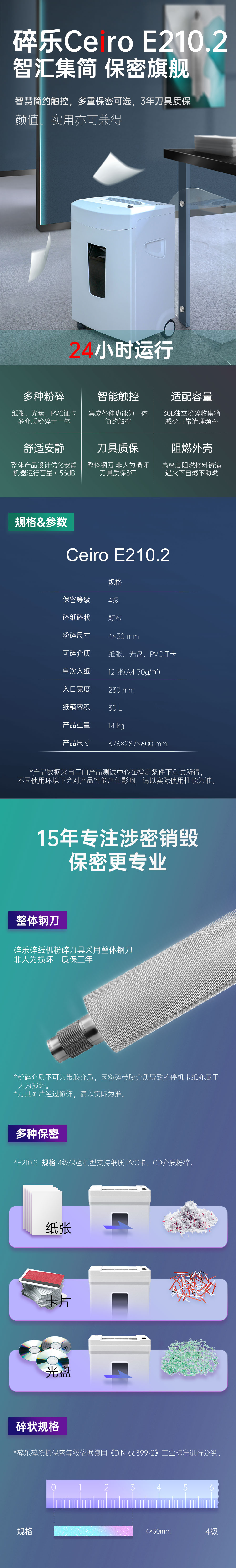 碎乐(Ceiro)E210.2碎纸机24小时运行德国4级保密,可碎卡、光盘、U盘 自营