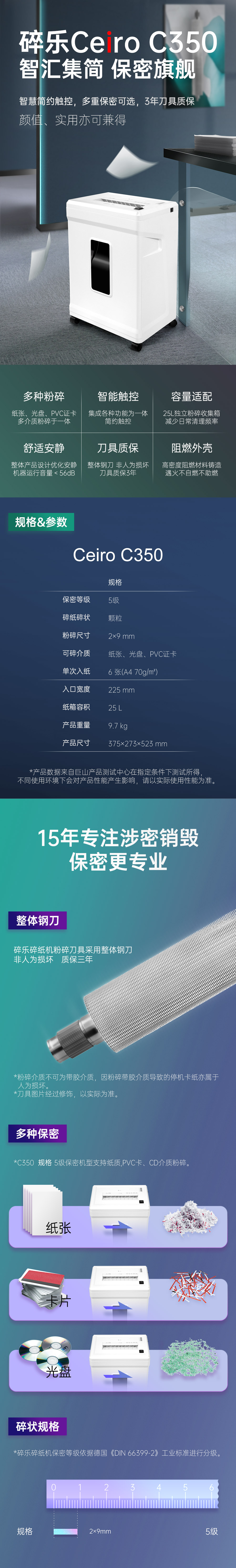 碎乐(Ceiro)C350碎纸机办公家用德国5级保密,可碎纸、PVC卡、光盘 自营