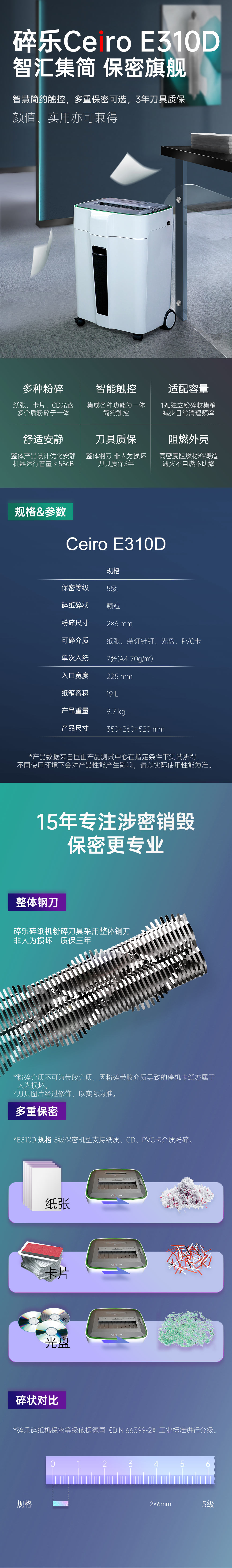 碎乐(Ceiro)E310D碎纸机办公家用德国5级保密,可碎纸、PVC卡、光盘 自营