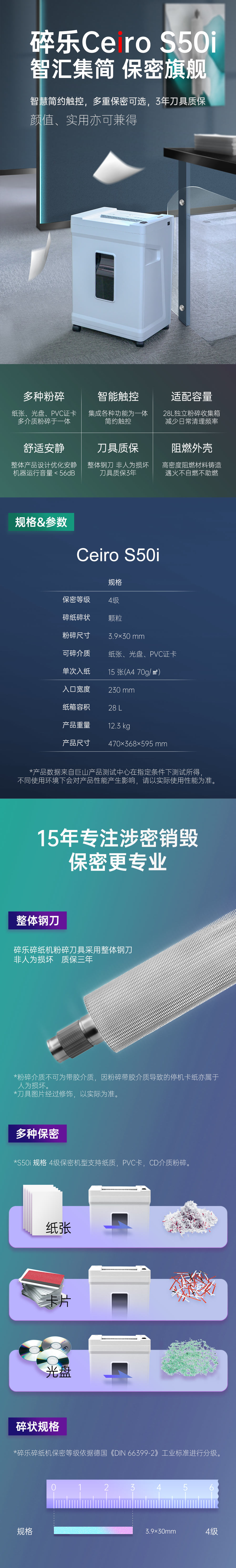 碎乐(Ceiro)S50i碎纸机办公家用德国4级保密,可碎纸、PVC卡、光盘 自营
