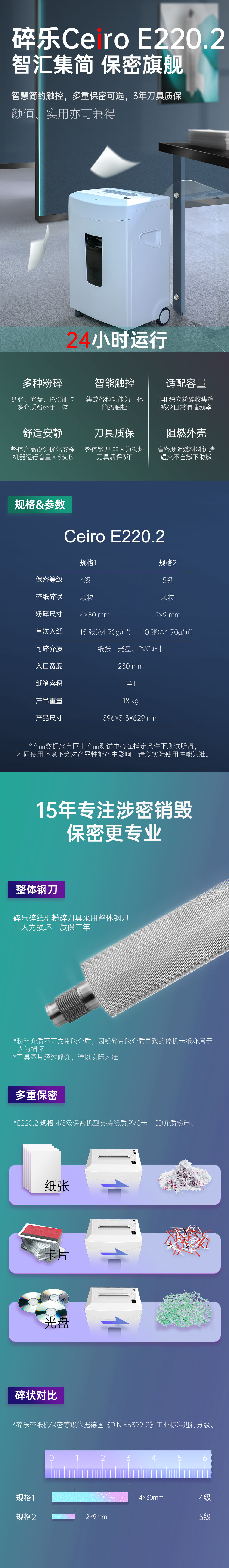 碎乐(Ceiro)E220.2碎纸机24小时运行德国5级保密,可碎卡、光盘、U盘 自营